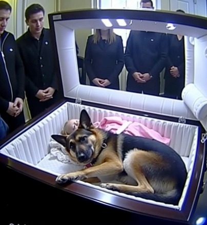 With trembling hands, the undertakers carefully unsealed the casket, their movements swift yet gentle, as if afraid of what they might find. Max, the German Shepherd, stood beside them, his tail wagging frantically as he continued to bark intermittently, urging them on, his eyes never leaving the casket. The sky, previously overcast, seemed to hold its breath along with the gathered mourners.
