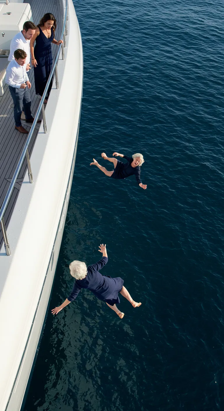 “Say hi to the sharks,” my daughter-in-law whispered as she pushed me off the yacht. My son, David, just stood there, smiling. Their plan was to steal my three-billion-dollar fortune. But when they returned home later that evening, I was sitting in my favorite armchair with a very special gift waiting for them.