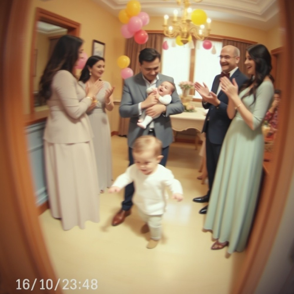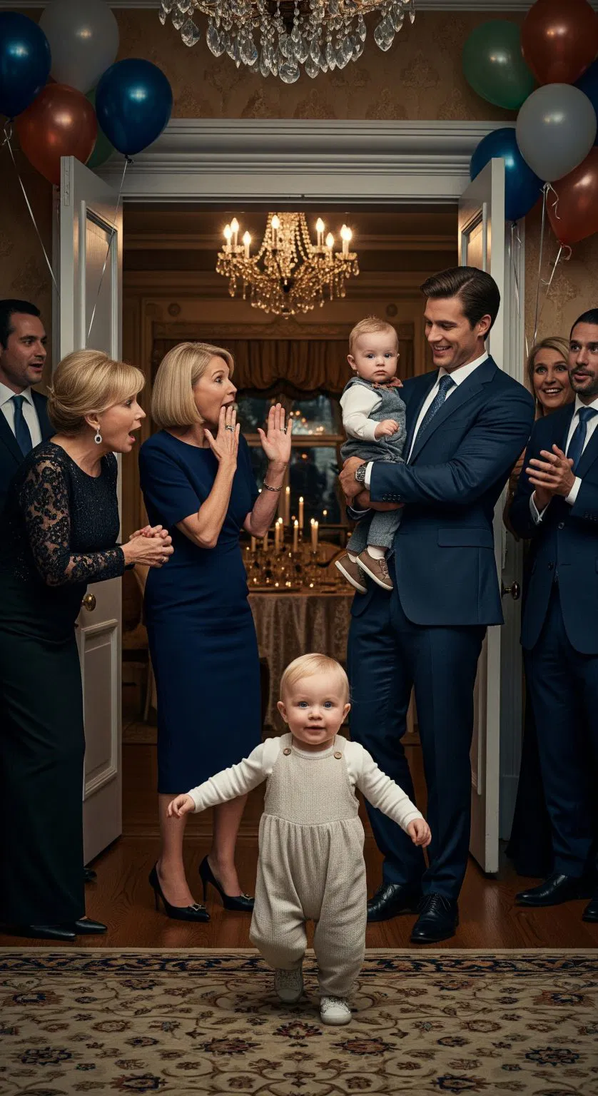 The room went completely silent. You could have heard a pin drop. James surveyed the room, taking in the decorations and the cluster of surprised faces all staring at him. Sophie was waking up more, looking around with curious eyes.