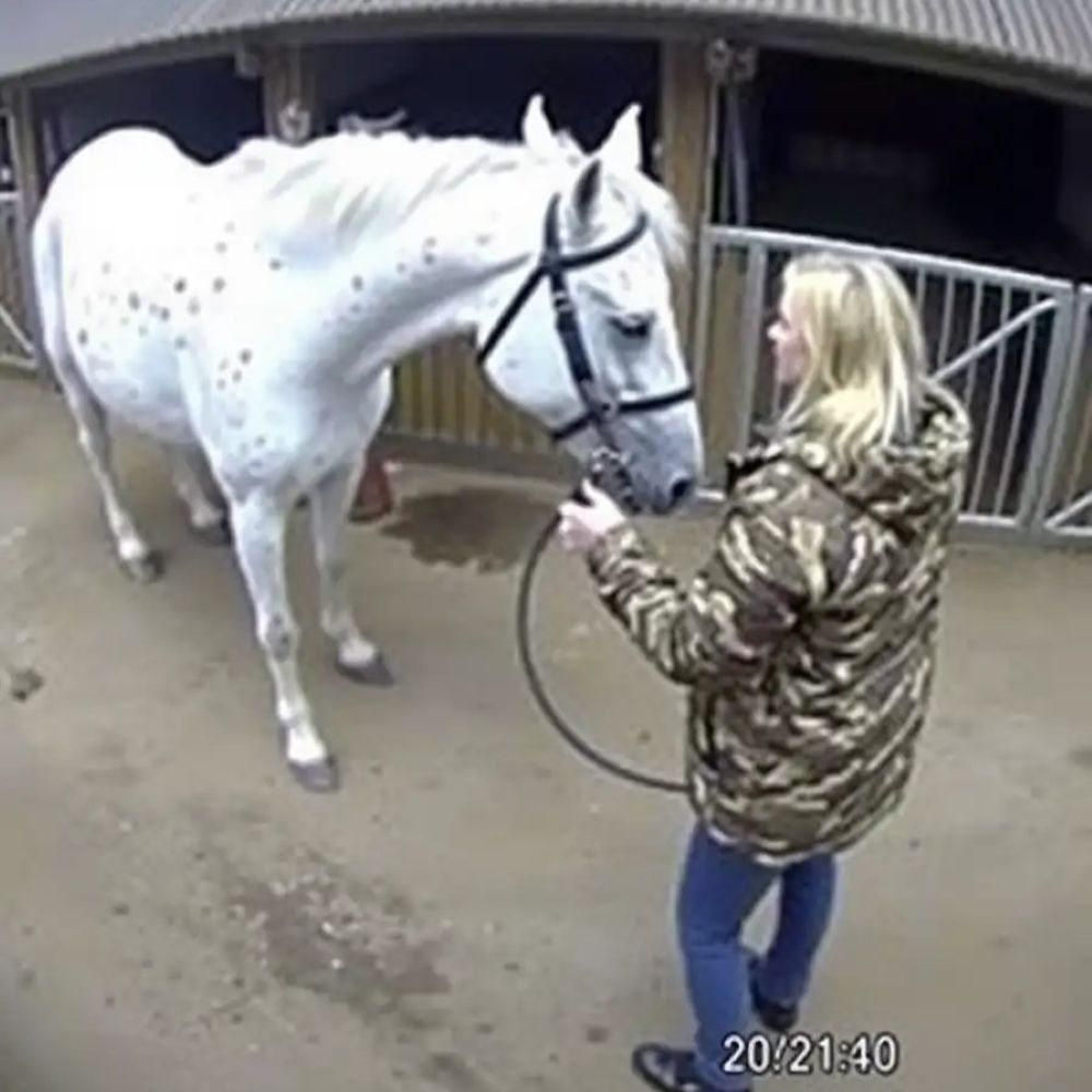 The horse stood behind her in the pen, white, restless, the muscles along his neck rippling like water beneath sunlight. He tossed his head once as if to test the air, then struck the gate with a hollow clang that made everyone nearby flinch.
