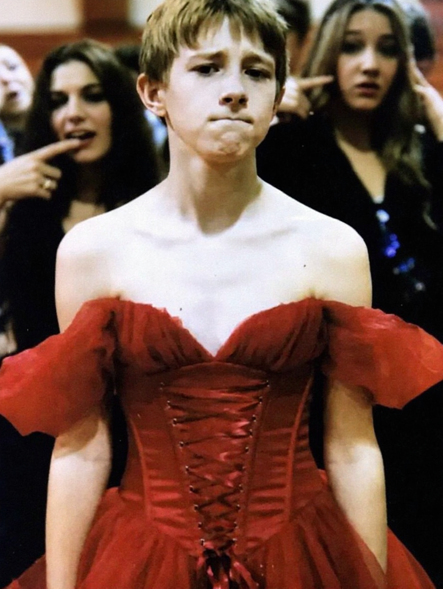 Liam walked through the doors wearing a flowing red dress that shimmered under the auditorium lights.