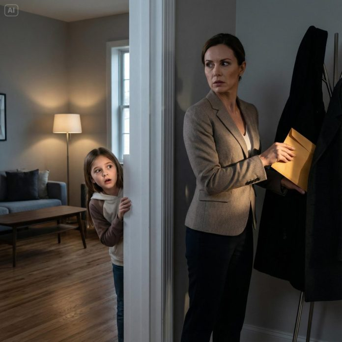 To her confusion, it wasn’t her mother who walked in. It was Aunt Caroline, Laura’s older sister. Caroline always carried herself with an air of control—expensive coat, stiff posture, cold eyes. She closed the door quietly behind her and immediately moved toward Laura’s coat hanging by the entryway. Emma watched in disbelief as her aunt slipped a small envelope, thick and slightly bent, into the inner pocket.
