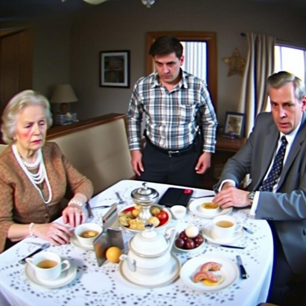 My son s:truck me last night, and I said nothing. This morning, I spread out my lace tablecloth, cooked a full Southern breakfast, and brought out the fine china as if it were a holiday. When he came downstairs, he took one look at the biscuits and grits, smirked, and said, “Looks like you finally learned.” But the smile vanished the moment he noticed who was seated at the table.